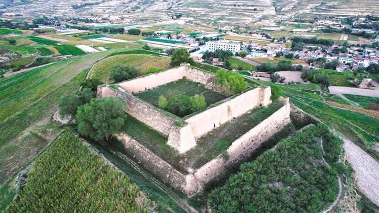 漫步騾子灘,附近的水家坡堡子也值得一去。這個(gè)堡子呈正方形,占地超4畝,不管從哪個(gè)視角看,都稱得上震撼。堡子分上下兩層,下層高5米、寬5米、邊長(zhǎng)55米,上層高6米、底部厚3.5米、頂部厚2米、邊長(zhǎng)35.5米。堡子外圍修有一圈寬5米、深6米、總長(zhǎng)230余米的壕溝,曾為護(hù)城河。堡子約建于1946-1948年間,用來(lái)辦公和防御戰(zhàn)爭(zhēng)。1949年8月,解放軍在水家坡地界圍剿國(guó)民黨馬步芳部隊(duì),經(jīng)過(guò)一天一夜戰(zhàn)斗,馬步芳部隊(duì)潰敗逃往新?tīng)I(yíng)方向,當(dāng)時(shí)有一發(fā)炮彈落在堡子一角,至今炮坑清晰可見(jiàn)。