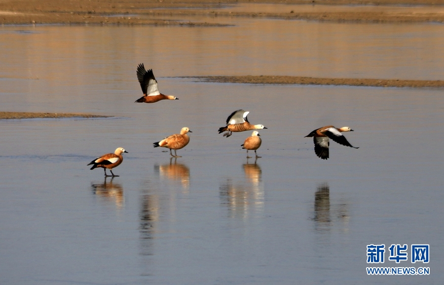 初冬時(shí)節(jié),位于鳴沙山下的甘肅省敦煌市黨河濕地,白鷺、綠頭鴨、赤麻鴨、灰雁等候鳥在這里棲息、飛翔、覓食,構(gòu)成了一幅和諧美麗的生態(tài)畫卷。