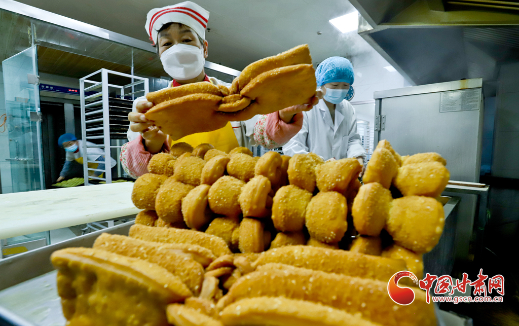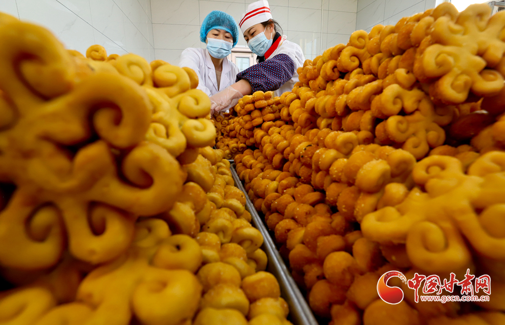 1月10日,在張掖市山丹縣一饃饃制作車(chē)間里,工作人員正在制作“糖花子”。