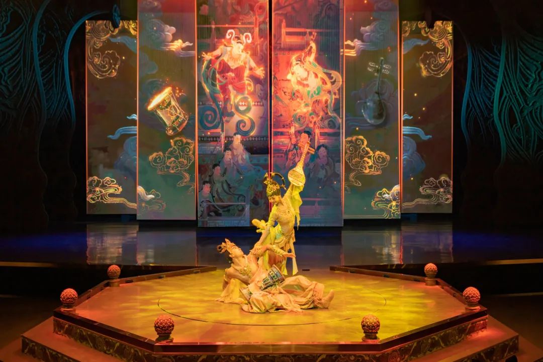 劇中運(yùn)用了五弦琵琶、排簫等民族樂器及敦煌仿制樂器,演繹了胡旋舞、琵琶舞等敦煌舞蹈,配合取材自敦煌古樂譜和西域曲調(diào)的劇目樂曲,還原了敦煌壁畫中的樂舞盛景。在演出模式上,《樂動(dòng)敦煌》打破了人和舞臺(tái)間的界限,讓觀眾置身劇場(chǎng),近距離感受敦煌傳承千年的古樂文化魅力。