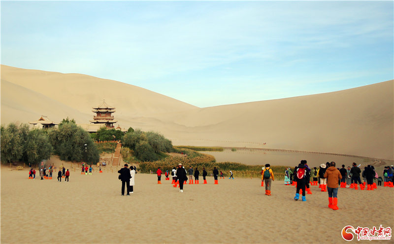 鳴沙山以沙動(dòng)成響而得名,峰巒危峭,山脊如刃。最早在東漢辛氏《三秦記》中有“河西有沙角山,峰崿危峻,逾于石山,其沙粒粗色黃,有如乾糒……人欲登峰,必步下入穴,即有鼓角之聲,震動(dòng)人足”的記載。而月牙泉是環(huán)抱在鳴沙山中的一灣清泉,形如玄月,故名“月牙泉”,并形成了鳴沙山月牙泉景區(qū),被譽(yù)為“塞外風(fēng)光之一絕”。