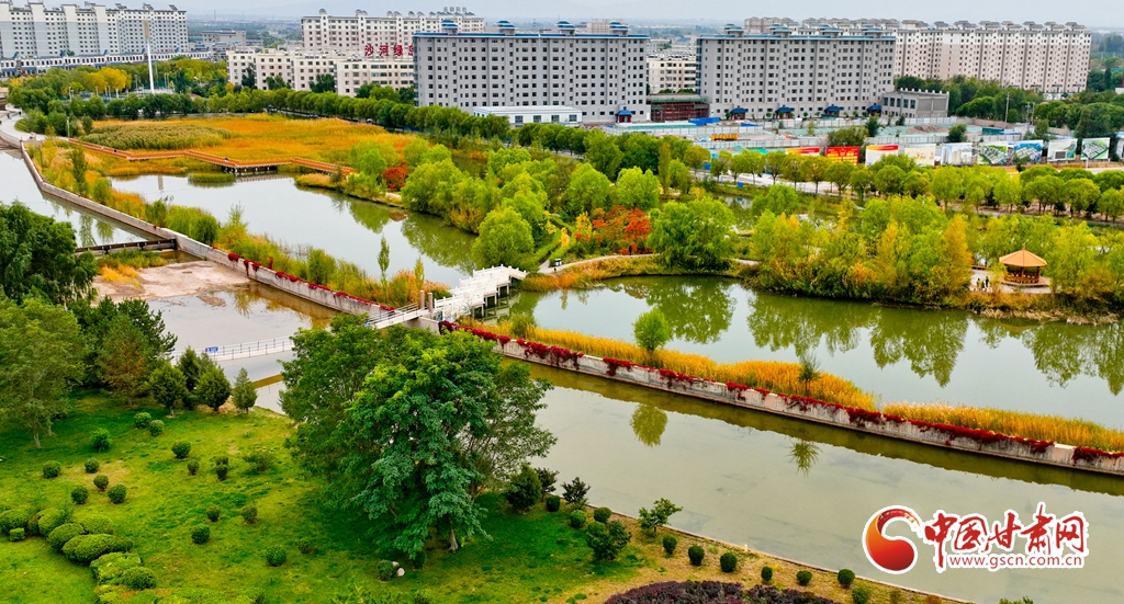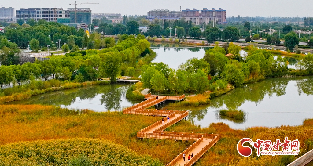10月5日,鳥瞰甘肅省張掖市臨澤縣,人行步道沿湖蜿蜒,湖水清澈潔凈,岸邊美景倒映湖中,一幅繪著水鄉(xiāng)之美的畫卷躍然眼前。