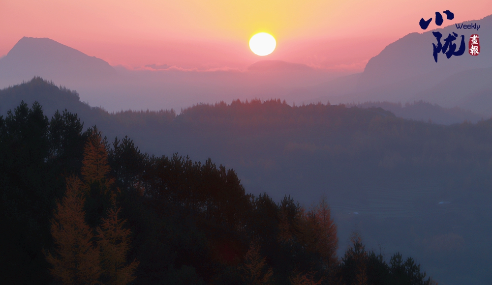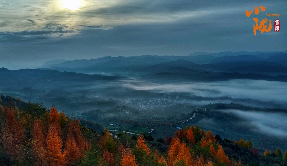 天空中布滿了烏云,云隙中的陽光和從四面八方漫過來的云霧、滿山彩林,把云華山點綴得像一幅筆墨清爽、疏密有致山水畫。