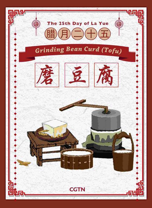 傳說玉皇大帝會在臘月二十五下凡巡視人間,看家家戶戶是否都過著誠實勤儉的生活。為了表現(xiàn)得節(jié)儉以獲得玉皇大帝降福,傳統(tǒng)上人們會磨豆腐來吃,豆腐在中國是一種便宜的食品。