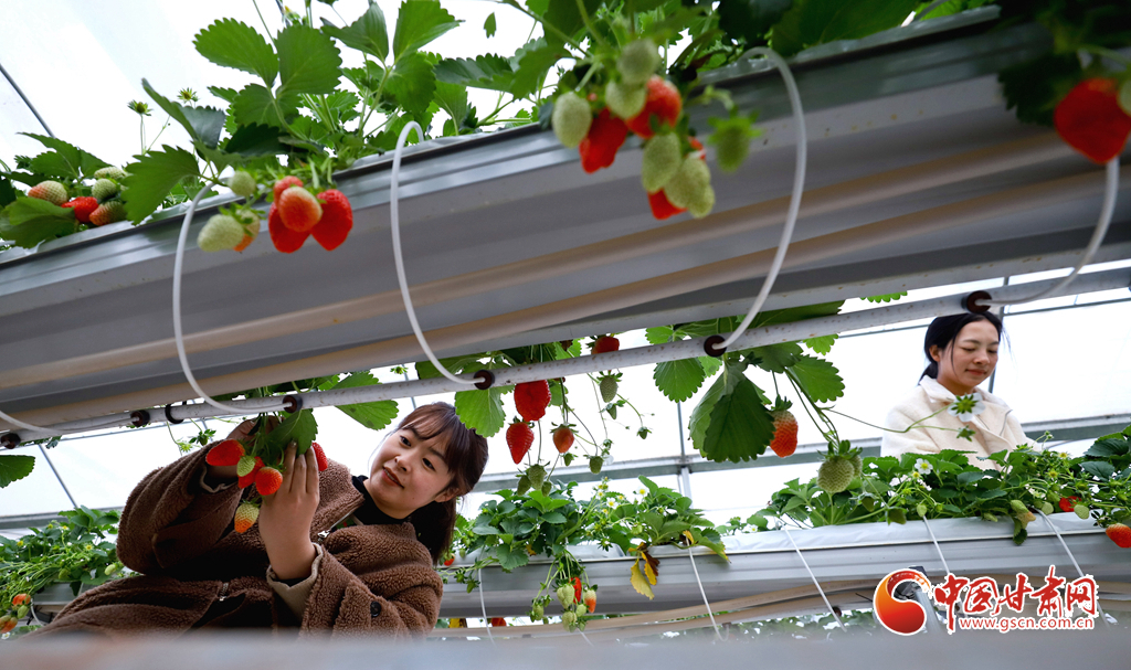 1月15日,甘肅省張掖市甘州區(qū)靖安鄉(xiāng)一草莓種植大棚內(nèi),游客正帶著小朋友采摘草莓。