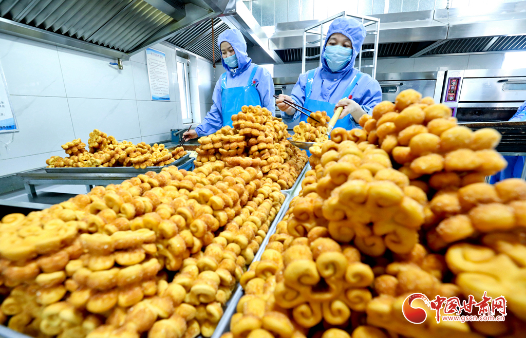 甘肅省張掖市山丹縣一食品加工坊,工作人員正在炸制“糖花子”。