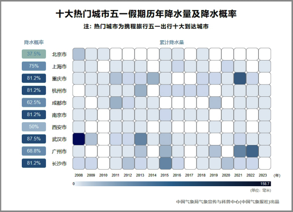 需要特別提醒的是,熱門城市中的廣州市雖然歷年降水量并不是特別大,但今年“五一”期間,華南地區(qū)還會延續(xù)前期雨水偏多的節(jié)奏,在五天假期的后半段將出現(xiàn)暴雨至大暴雨,去往廣州及周邊等地旅行,需及時(shí)關(guān)注當(dāng)?shù)貧庀蟛块T發(fā)布的預(yù)報(bào)預(yù)警,提前安排行程。