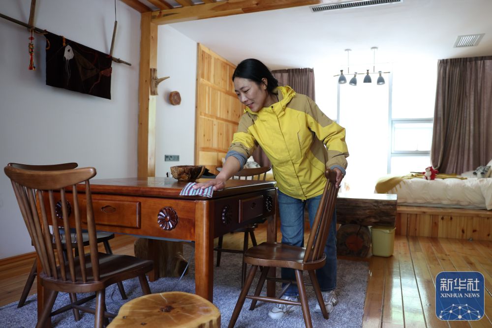 ↑ 工作人員在迭部縣旺藏鎮(zhèn)次日那村的一家民宿里打掃衛(wèi)生(6月28日攝)。新華社記者 方欣 攝