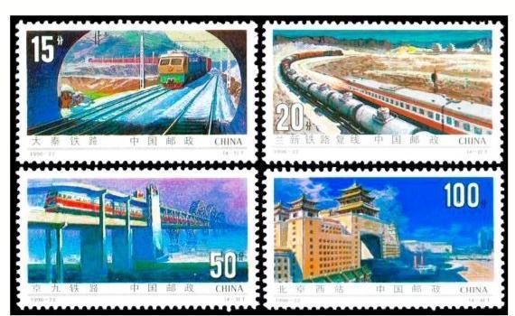 1996年9月,我國(guó)發(fā)行編號(hào)為1996-22的《鐵路建設(shè)》郵票一套四枚,其中T4-2圖為蘭新鐵路復(fù)線。票面上,一貨一客兩列火車蜿蜒在蘭新鐵路復(fù)線,氣勢(shì)如虹。而嘉峪關(guān)關(guān)城作為一個(gè)地理標(biāo)志,被處理成蘭新鐵路復(fù)線的背景圖案,放在郵票主圖的后方。盡管由于票面所限,背景圖案上的嘉峪關(guān)關(guān)城畫面很小,無(wú)以淋漓盡致地表現(xiàn)嘉峪關(guān)城樓的細(xì)節(jié),但其“天下第一雄關(guān)”的雄姿絲毫不減。而嘉峪關(guān)出現(xiàn)在表現(xiàn)甘肅特色乃至蘭新交通主線的票面上,也足見其地理位置的重要性。