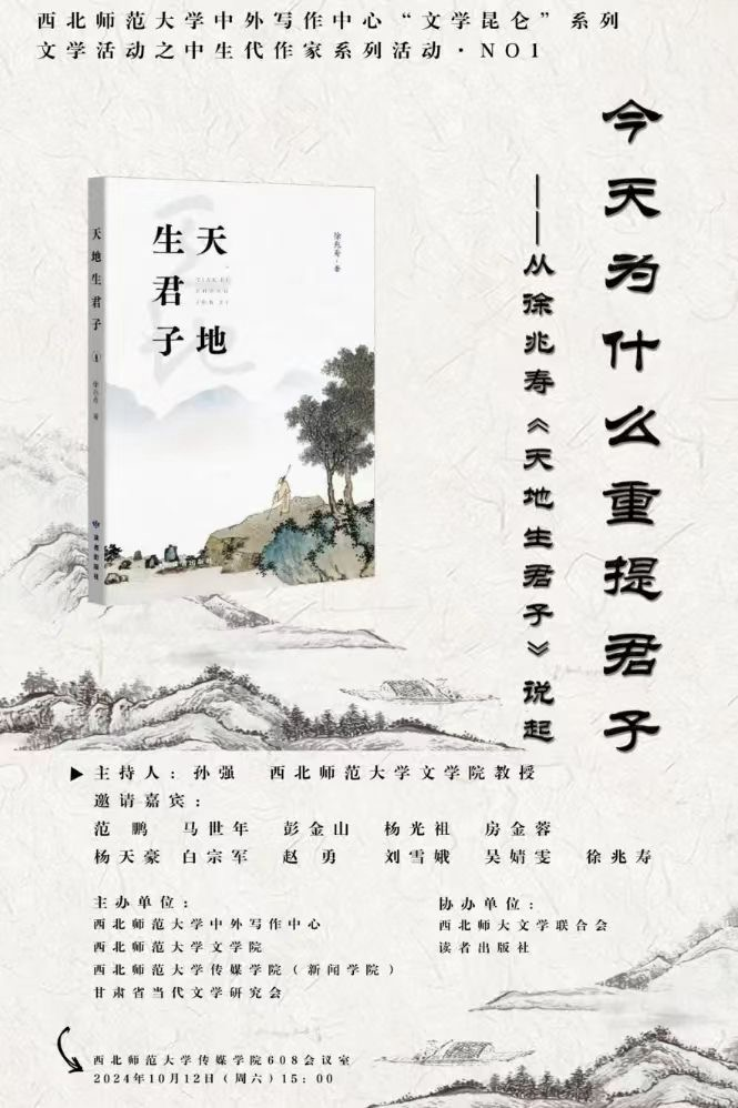 2024年10月12日,由西北師范大學中外寫作中心、西北師范大學文學院、西北師范大學傳媒學院、甘肅省當代文學研究會聯(lián)合主辦的“文學昆侖”之中生代作家系列活動“今天為什么重提君子——從徐兆壽《天地生君子》說起” 徐兆壽《天地生君子》作品分享會在西北師范大學舉辦。