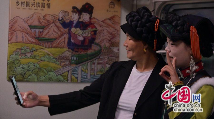 沿途,每當(dāng)列車停靠在車站等待的時間,彝族老鄉(xiāng)在鐵路工作人員的協(xié)同配合下搬起水果,牽起牛羊,抱起雞鴨放進一節(jié)節(jié)行李車廂上,慢火車的貨架上擺滿了農(nóng)產(chǎn)品。車廂里,人們互相交談,圍坐在一起放聲歌唱,好不熱鬧,歡樂的聲音從車廂內(nèi)傳出,像是在向廣袤的山川大地宣告著彝歷新年的盛事。