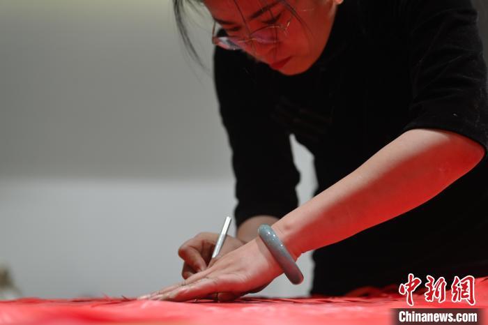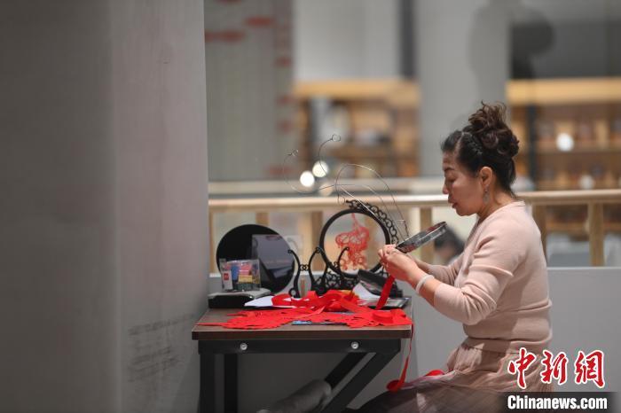 11月23日,甘肅省蘭州市楊樹(shù)珍剪紙工作室內(nèi),楊樹(shù)珍團(tuán)隊(duì)成員制作剪紙漢服作品。中新社記者 李亞龍 攝