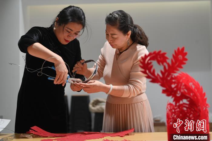 11月23日,甘肅省蘭州市楊樹(shù)珍剪紙工作室內(nèi),楊樹(shù)珍(左)帶領(lǐng)團(tuán)隊(duì)成員制作剪紙漢服。中新社記者 李亞龍 攝