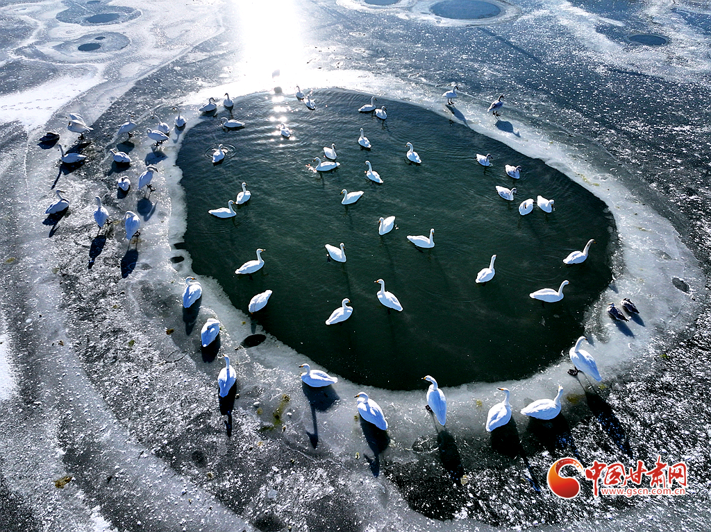 近日,在甘肅省張掖國家濕地公園,成群的越冬天鵝在冰封的湖面上悠然覓食、嬉戲,構成了一幅動人的生態(tài)畫卷,成為冬日里一道尤為引人注目的風景線。