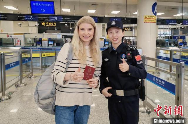 1月12日,挪威籍學生海琳(Helene)點贊皇崗邊檢站民警優(yōu)質服務并合影留念。(皇崗邊檢站供圖)