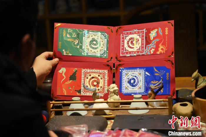 1月10日,在甘肅省敦煌市敦煌畫院內(nèi),游人參觀由敦煌畫院設(shè)計(jì)授權(quán)的中國郵政《敦煌福蛇》極限型明信片。中國郵政《敦煌福蛇》極限型明信片從敦煌壁畫里的藻井汲取靈感,集合敦煌紋樣、民藝剪紙等中國傳統(tǒng)藝術(shù)內(nèi)容,以春萌蛇、夏長蛇、秋實(shí)蛇、冬藏蛇對(duì)應(yīng)著四季祝福。中新社記者 李亞龍 攝