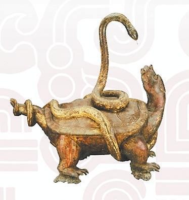 玄武是“四神”中的北方之神?!洞蟠鞫Y》:“龜上彎象天,下平法地。千載神龜,問無不知,廣育無雄,以蛇為雄。故龜與蛇合謂玄武”。因此龜蛇形象的組合亦有陰陽交接之意。除了瓦當(dāng)、畫像磚、雕塑外,古人還常將此二物繪于旗上,用于指揮軍隊、消災(zāi)避害之用。