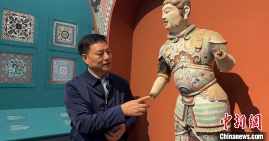 2023年2月,甘肅省蘭州市,汪萬(wàn)福在敦煌藝術(shù)館向中新社記者介紹莫高窟第194窟南方增長(zhǎng)天王塑像復(fù)制過(guò)程?!⊥跄劣?nbsp;攝
