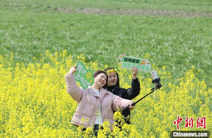 圖為游客在彭澤縣棉船鎮(zhèn)萬(wàn)畝油菜花田里拍照打卡。彭琴 攝