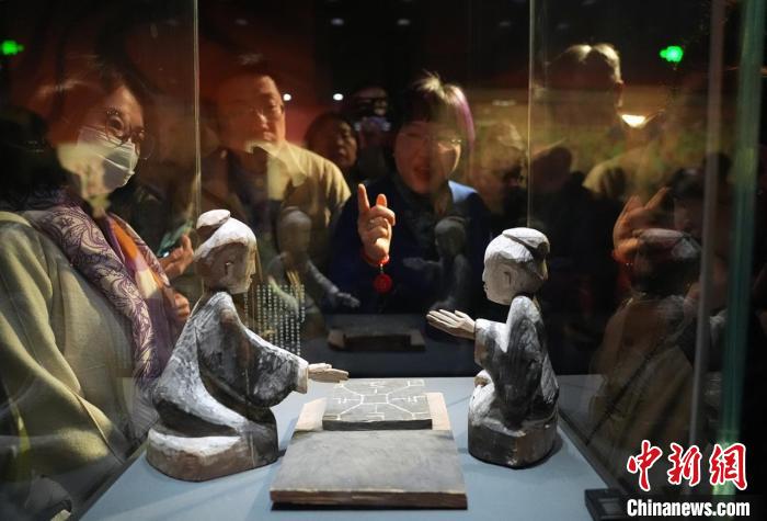 3月30日,觀眾在講解員的引導(dǎo)下欣賞甘肅省博物館藏的西漢彩繪木六博俑。 史春陽(yáng)攝