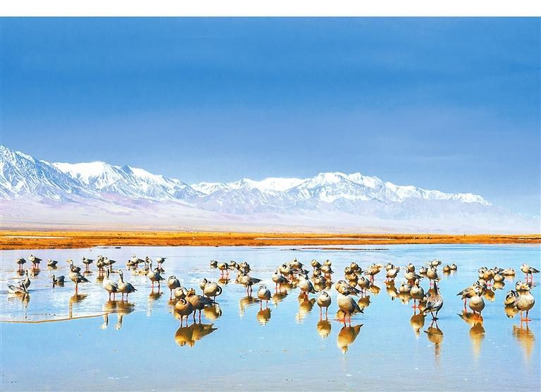 當(dāng)祁連山的雪線(xiàn)以肉眼難以察覺(jué)的速度后退時(shí),鹽池灣的冰封鏡面開(kāi)始出現(xiàn)裂紋。最先感知到這一變化的不是融水沖刷出的溝壑,而是斑頭雁黃色的喙。它們?cè)谌碌椎某炕杈€(xiàn)上劃過(guò),雙翅呼呼生風(fēng)。冰凌碎屑尚未與雁羽摩擦,便已發(fā)出細(xì)密的簌響,像是古琴開(kāi)弦前的調(diào)音。野馬南山與黨河南山兩山之間形成的盆地內(nèi)河流縱橫、湖泊密布,草甸、沼澤交錯(cuò),是斑頭雁和其他水鳥(niǎo)世代棲息繁衍的場(chǎng)所。盡管先頭部隊(duì)在3月下旬就已抵達(dá)這里,主力部隊(duì)卻要到4月上旬才會(huì)姍姍來(lái)遲。此時(shí)斑頭雁幼體已在越冬地充分發(fā)育,羽衣上幾乎看不到如苔蘚般斑駁生長(zhǎng)的新羽,只是頭部的兩條黑帶不如父母深邃,這是它們少經(jīng)風(fēng)霜的證明。它們降落在濕地灘涂時(shí),雝雝鳴雁,那聲音或許與兩千年前蘇武牧羊時(shí)在北海之畔聽(tīng)到的有些許相似。