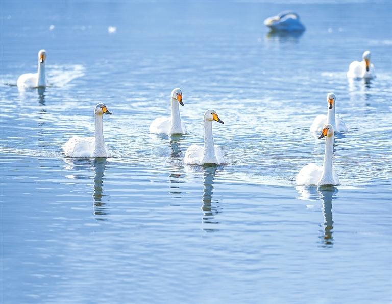 蘭州三江口濕地的冰封河畔上,大天鵝用喙基布滿(mǎn)冰霜的橙喙鑿開(kāi)生存通道。這里是目前野生天鵝在蘭州的唯一越冬所,為冬日黃河增添了一份靈動(dòng)和生機(jī)。這些北方來(lái)客的羽毛并非純白,頸部沾染鹽霜草漬后形成獨(dú)特的顏色與紋路,像是歲月在它們身上留下的印記。當(dāng)?shù)亟M織了巡護(hù),并有專(zhuān)人定期投飼。