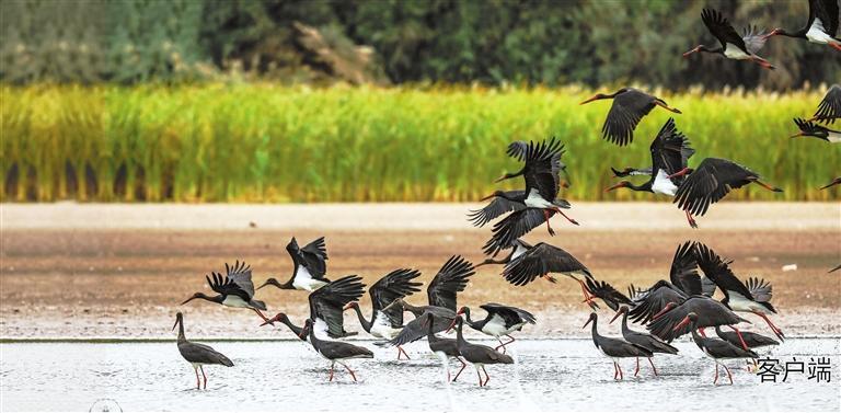 九月的黑河濕地,蘆葦蕩在秋陽(yáng)下鍍成金箔,黑鸛群如流動(dòng)的墨玉鑲嵌其中。這種因其配色和珍稀程度被稱(chēng)為“鳥(niǎo)中熊貓”的珍禽,是出色的捕魚(yú)能手。隨著它精準(zhǔn)鎖定水下獵物,赤紅色長(zhǎng)喙掠過(guò)水面,黑、白、紅的絕色搭配如同流動(dòng)的墨畫(huà)。中國(guó)最大的黑鸛種群——600余只在此集結(jié),夜棲時(shí)其倒影連成一線(xiàn),讓觀鳥(niǎo)者想起傳世的水墨長(zhǎng)卷。
