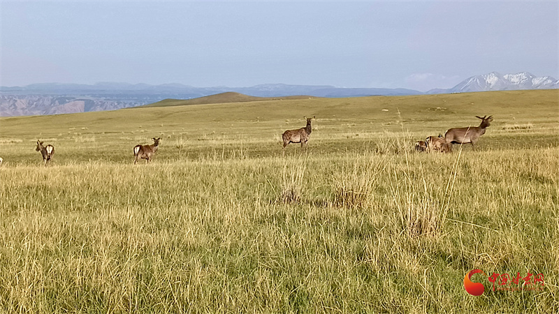初夏的肅南大河草原牧草逐漸返青,一群群馬鹿在草原上悠閑覓食,游客到來(lái)并沒(méi)有打擾它們的正?;顒?dòng)。