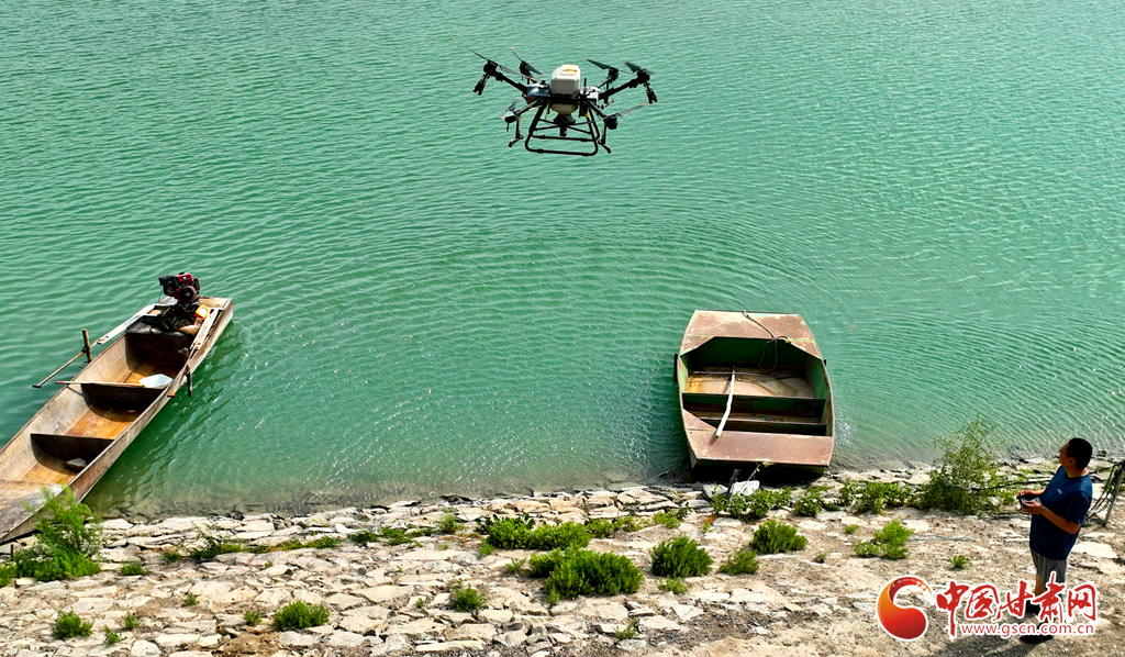 6月24日,在高臺縣夾溝湖水庫螃蟹養(yǎng)殖基地,無人機操作手啟動設備,載滿飼料的無人機沿預設航線在800多畝螃蟹養(yǎng)殖基地上空精準投喂。