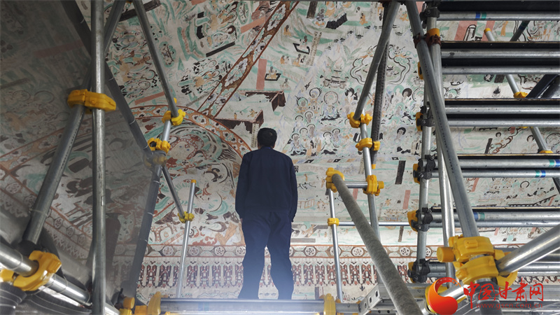 為了配合壁畫(huà)、彩塑修復(fù),第55窟共搭建了5層腳手架。修復(fù)師仰頭、彎腰、躺著作業(yè)是常態(tài),修復(fù)塑像時(shí),甚至要跪著、趴著鉆進(jìn)狹小空間,一待就是數(shù)小時(shí),起身時(shí)腰酸背痛、腿腳發(fā)麻。