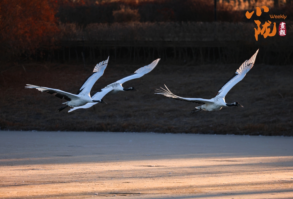 在這片天地之間,丹頂鶴的身影時隱時現(xiàn),它們或悠閑漫步,或展翅飛翔,使冬日的濕地充滿生機(jī)。