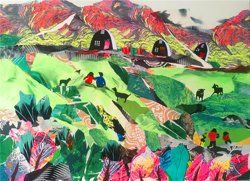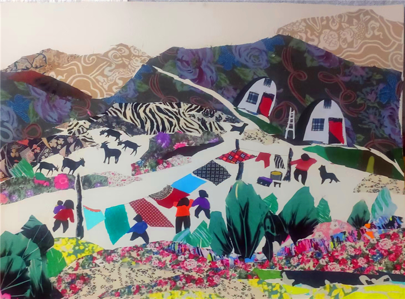 裁剪環(huán)節(jié)更見功力。她以“銳利”之心駕馭剪刀,根據(jù)畫面需求將碎布剪成不同形狀,有的需棱角分明,有的要圓潤柔和。粘貼時,她摒棄簡單的粘合方式,采用傳統(tǒng)縫補與現(xiàn)代鑲嵌相結(jié)合的技法,讓布料與底板緊密貼合,既保證了作品的耐久性,又營造出自然的浮雕感。在《黃土風(fēng)情》布貼畫中,她用層層疊疊的碎布表現(xiàn)黃土高原的溝壑縱橫,用深淺不一的色塊勾勒窯洞的錯落有致,指尖翻飛間,碎布頭便有了筋骨與神韻。