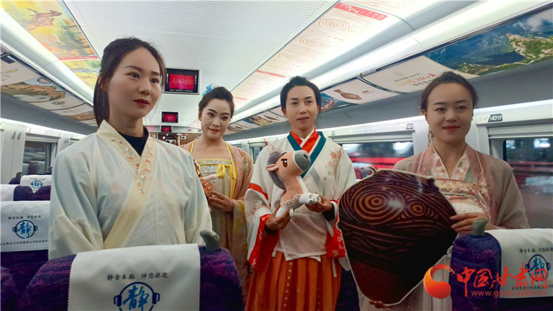 這趟列車,是敦煌研究院、甘肅省博物館、甘肅簡牘博物館、蘭州市博物館、天水市博物館、武威市博物館、平涼市博物館、臨夏州彩陶館(州博物館)、和政古動物化石博物館九家國家一級博物館聯(lián)袂打造的“高鐵流動博物館”。